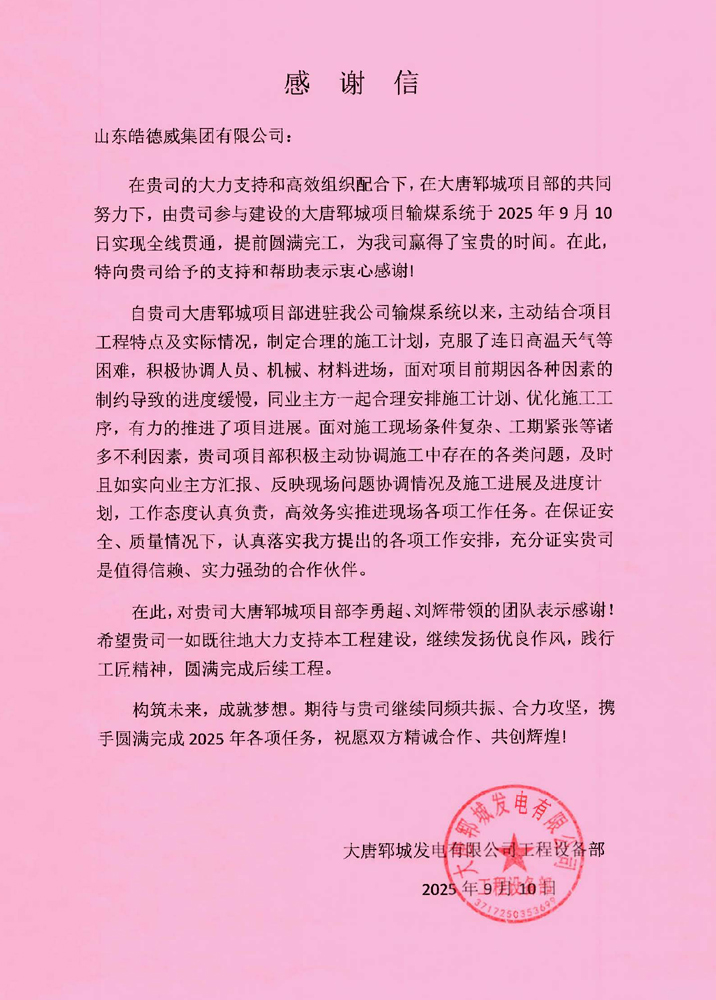 2025年9月11日,大唐郓城发电有限公司项目施工现场传来喜讯:在李勇超、刘辉的带领下,在项目部全体参建人员的共同努力下,输煤系统安装工程于2025年9月10日实现全线贯通,较原计划显著提前。这一关键节点的顺利完成,为项目整体推进奠定了坚实基础,并获得业主高度认可,大唐郓城发电有限公司专门给公司发来感谢信。