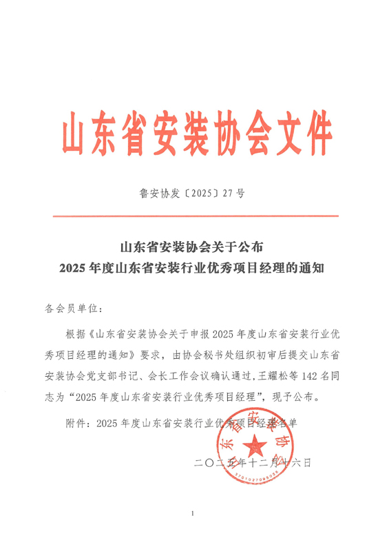 热烈祝贺公司荣获2025年度山东省安装行业先进集体荣誉称号暨韩立功荣获先进个人荣誉称号